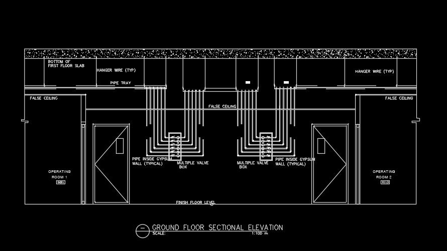 Ground floor section elevation AutoCAD drawing is given in this file. The bottom of first floor slab, false ceiling, pipe tray, hanger wire, pipe inside gypsum wall, multiple valve wall, operation room 1, operation room 2, and floor finish levels are mentioned. For more details download the AutoCAD drawing file from our cadbull website.