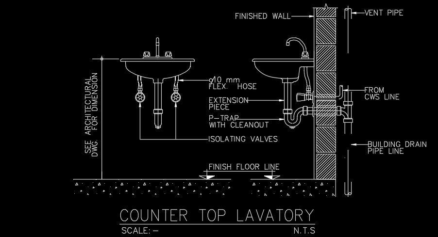 Countertop lavatory AutoCAD drawing is given in this file. Isolating valves, CWS line, building drain pipe line, extension piece, finished wall, vent pipe, and other details are mentioned. For more details download the AutoCAD drawing file from our cadbull website.