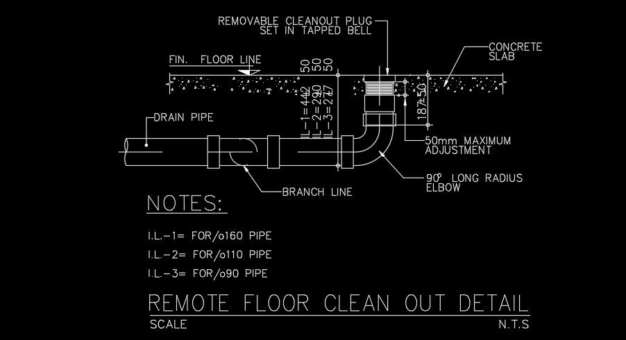 Remote floor clean out detail drawing is given in this AutoCAD file. Branch line, concrete slab, 50mm maximum adjustment, long radius elbow, cleanout plug, and other details are mentioned. For more details download the AutoCAD drawing file from our cadbull website.
