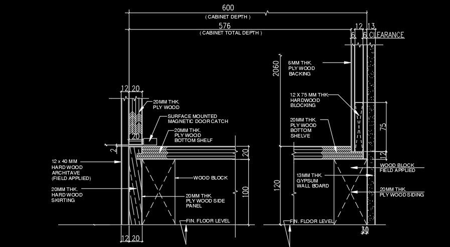 576mm cabinet width AutoCAD drawing is given in this file. Surface mounted magnetic door catch, 13mm thickness gypsum board, 20mm thickness ply wood top panel, 8mm thickness hard wood edge trim, wood shim spacer, and other details are mentioned. For more details download the AutoCAD drawing file from our cadbull website.