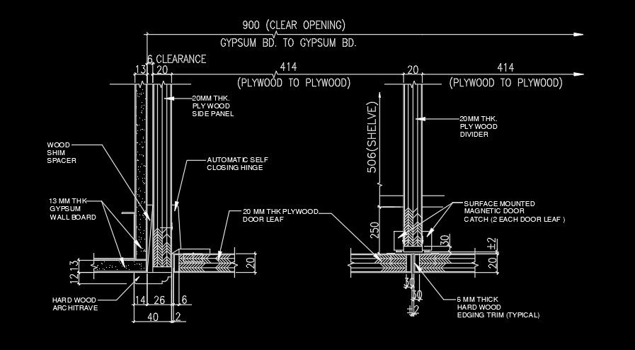 900mm cabinet width construction drawing is given in this AutoCAD file.20mm thickness ply wood divider, wood shim spacer, 13mm thickness gypsum wall board, hard wood architrave, 6mm thickness hard wood edging trim, surface mounted magnetic door catch, and automatic self closing hinge, 20mm thickness ply wood side panel, and other details are mentioned. For more details download the AutoCAD drawing file from our cadbull website.
