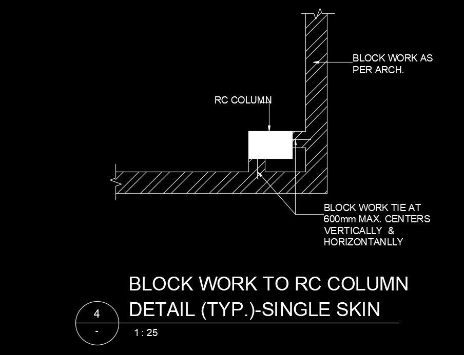 Block work to RC column single skin typical detail drawing is given in this AutoCAD file. This drawing is provided with the 1:25 scale. Block work tie at 600mm maximum centers vertically & horizontally, block work as per arch are mentioned. For more details download the AutoCAD drawing file from our website.