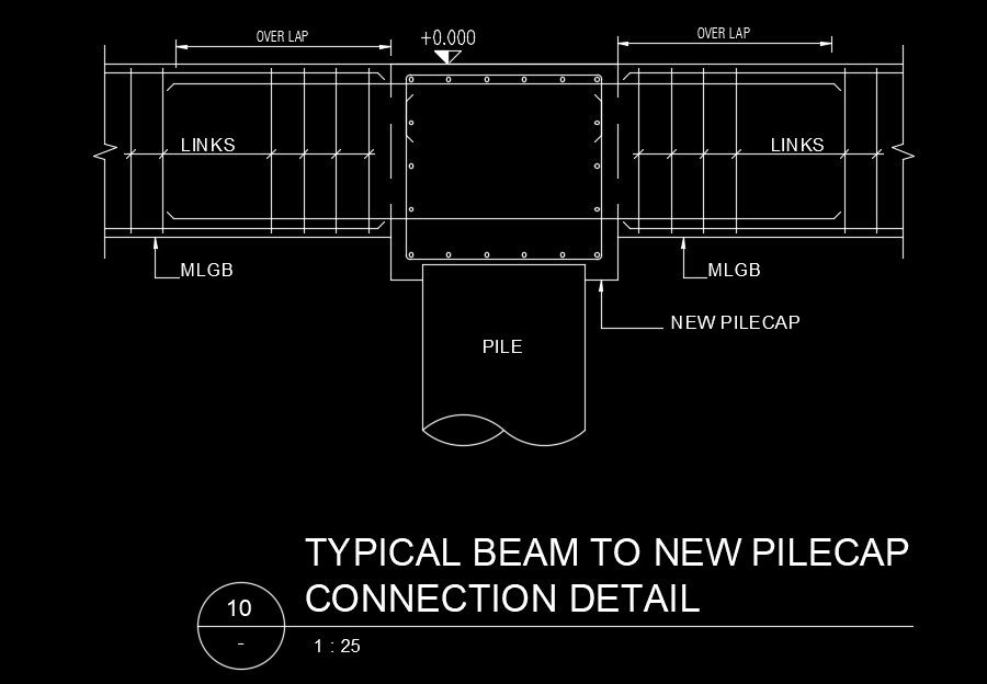 Typical beam to new pile cap connection detail drawing AutoCAD file is given. New pile cap, reinforcement, links, over lap, and other details are mentioned. For more details download the AutoCAD drawing file from our website.