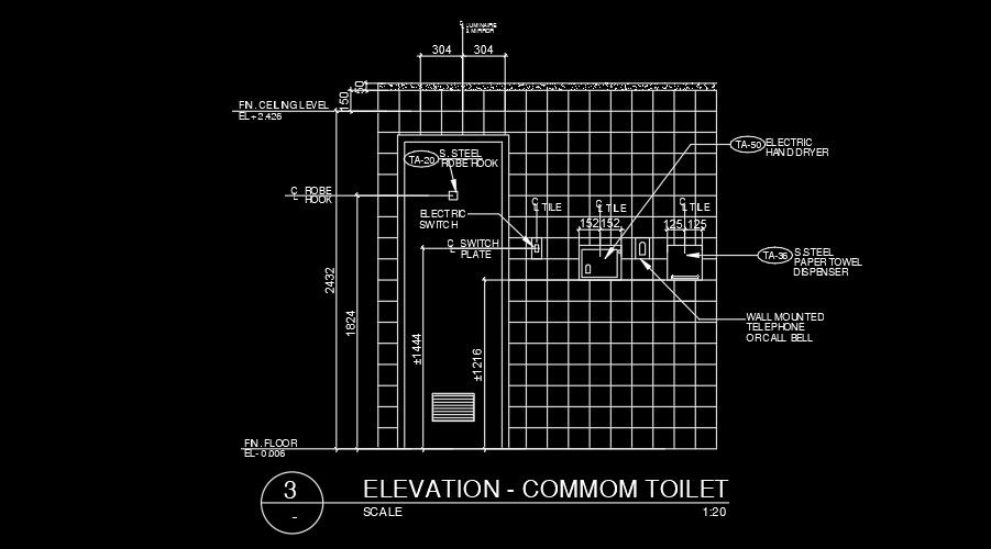 2432mm height of the common toilet front elevation AutoCAD drawing is given in this file. Wall mounted telephone or call bell, stainless steel paper tower dispenser, electric hand dryer, switch plate, and other details are mentioned in this drawing. For more details download the AutoCAD drawing file from our cadbull website.