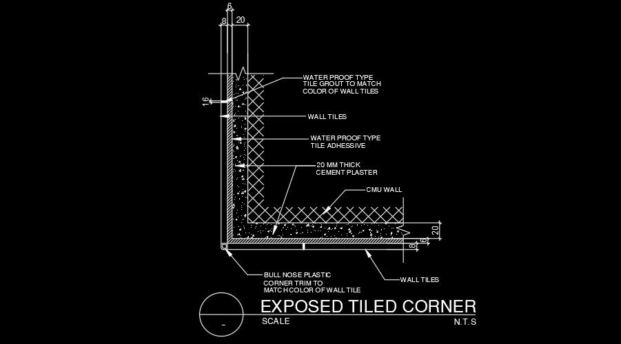 The exposed tiled corner AutoCAD drawing is given in this file. Wall tiles, water proof type tile adhesive, 20mm thick cement plaster, bull nose plastic corner trim to match color of wall tile, and other details are mentioned. For more details download the AutoCAD drawing file from our cadbull website.