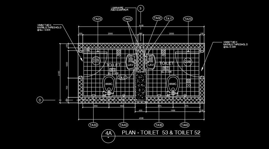 4550x2100mm toilet plan is given in this AutoCAD file. Two bathrooms are available. On each toilet, western toilet, and lavatories are available. For more details download the AutoCAD drawing file from our cadbull website.