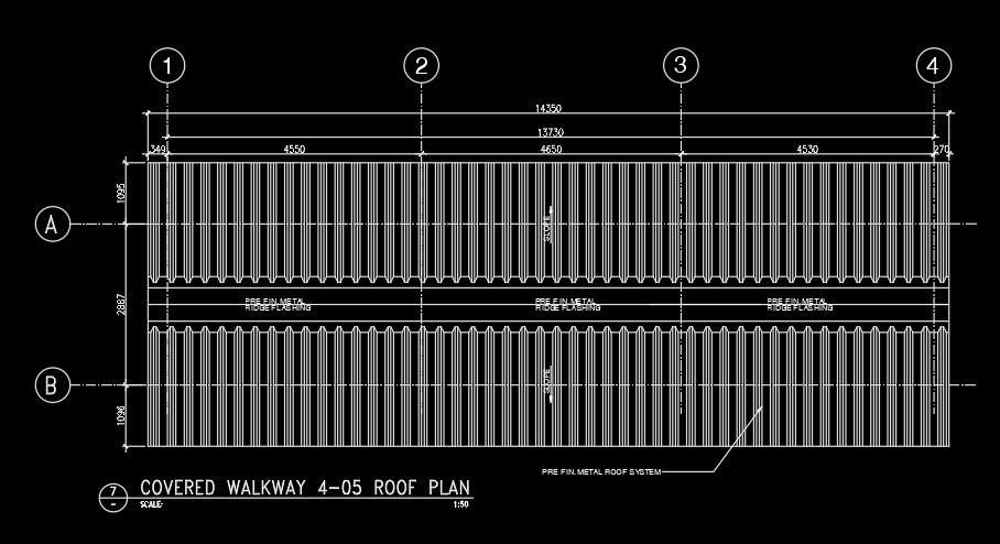 A covered walkway roof plan AutoCAD drawing is given in this file. Pre metal roof system is provided. The length and breadth of the walkway are 15m and 3.13m respectively. For more details download the AutoCAD drawing file from our cadbull website.