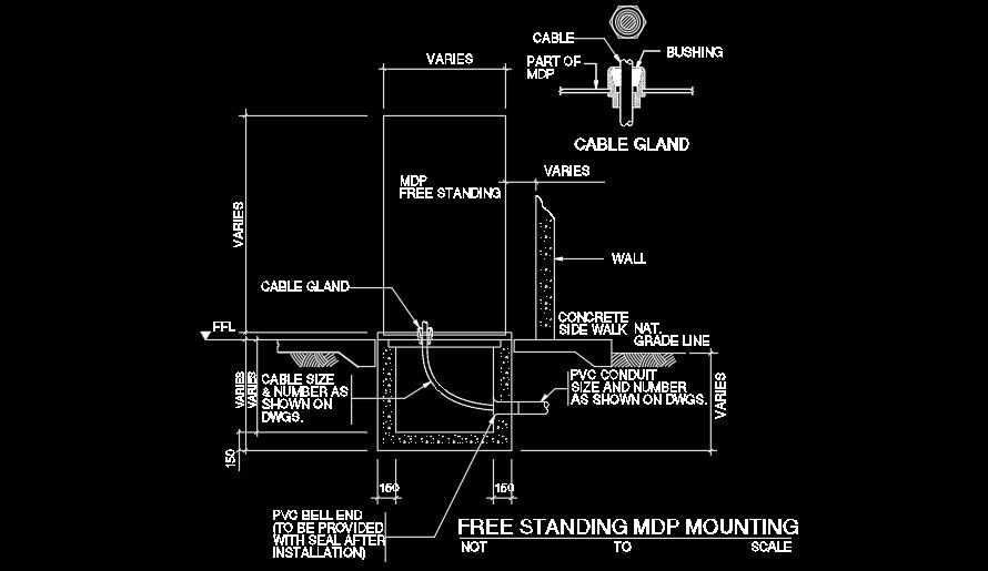 Freestanding MDP mounting drawing is given in this AutoCAD file. Cable gland, wall, free standing, busing, part of MDP, PVC bell end, and other details are mentioned. For more details download the AutoCAD drawing file from our cadbull website.