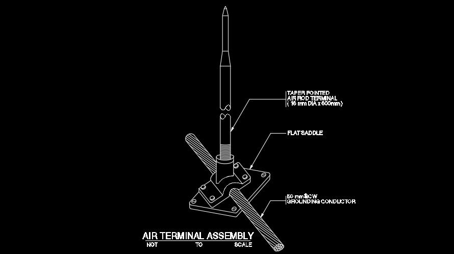 Air terminal assembly 2D AutoCAD drawing is given in this file. 60mm BCW grounding conductor, flat saddle, taper pointed air rod terminal, and other details are mentioned. For more details download the AutoCAD drawing file from our cadbull website.