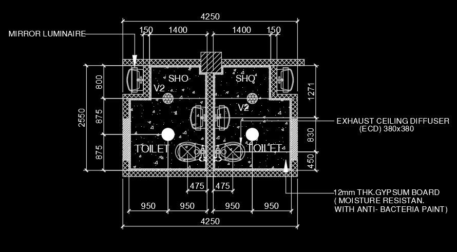 4250x2550mm female bathroom luminaire construction drawing is given in this AutoCAD file. 20mm plaster, 10mm tiles, 8mm adhesive, 12mm thickness of the gypsum board, exhaust ceiling diffuser, and other details are mentioned. For more details download the AutoCAD drawing file from our cadbull website.
