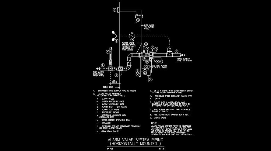 Alarm valve system piping line AutoCAD drawing is given in this file. Gate valve, check valve, drain pipe, main drain valve, and other details are provided. For more details download the AutoCAD drawing file from our cadbull website.