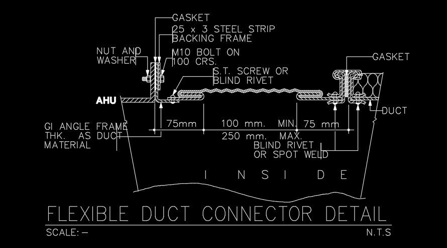 A flexible duct connector detail drawing is given in this AutoCAD file. Gasket, nut and washer, duct, angle frame, steel strip backing frame, blind rivet, spot weld, and other details are mentioned. For more details download the AutoCAD drawing file from our cadbull website.