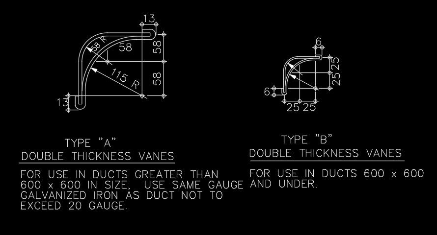 Type A and B double thickness vanes drawings are given in this AutoCAD file. The dimension of the duct is 600x600mm. For more details download the AutoCAD drawing file from our cadbull website.