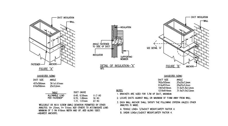Detail of duct insulation AutoCAD drawing is given in this file. Anchor, fastener, duct insulation, wall, angel fastened, duct sizes, angle dimensions, and other details are mentioned. For more details download the AutoCAD drawing file from our cadbull website.