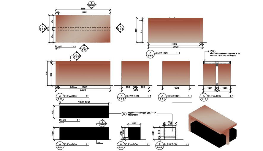 1600x450mm store box design AutoCAD plan is given in this file. The second plan dimension is 450x450mm. The front and right side of the elevation views are given. 2 Plan and elevation view of the boxes are given. The measurement details are given clearly. For more details download the AutoCAD drawing file from our cadbull website.