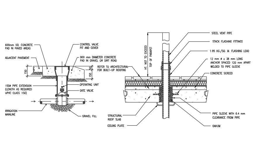 Valve connection AutoCAD drawing is given in this file. Control valve, gate valve, 15mm dia pipe extension, irrigation manhole, adjacent pavement, structural roof slab, ceiling plate, concrete screed, steel vent pipe, stack flashing fitting, and built up roofing is mentioned. For more details download the AutoCAD drawing file from our cadbull website.