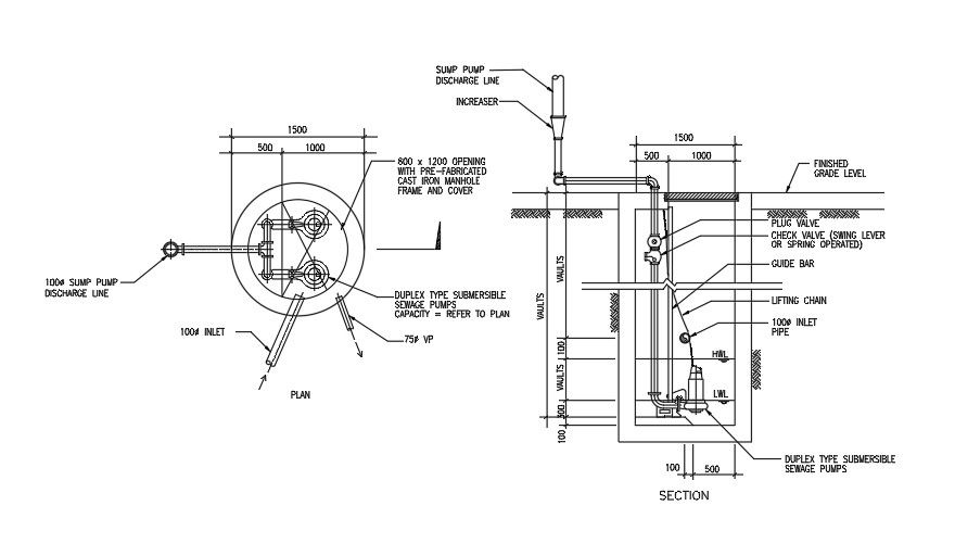 1500mm diameter manhole plan AutoCAD drawing is given. Sump pump discharge line is provided at the top. 100mm dia inlet pipe, guide bar, lifting chain, check valve, plug wall, and opening details are mentioned. For more details download the AutoCAD drawing file from our cadbull website.