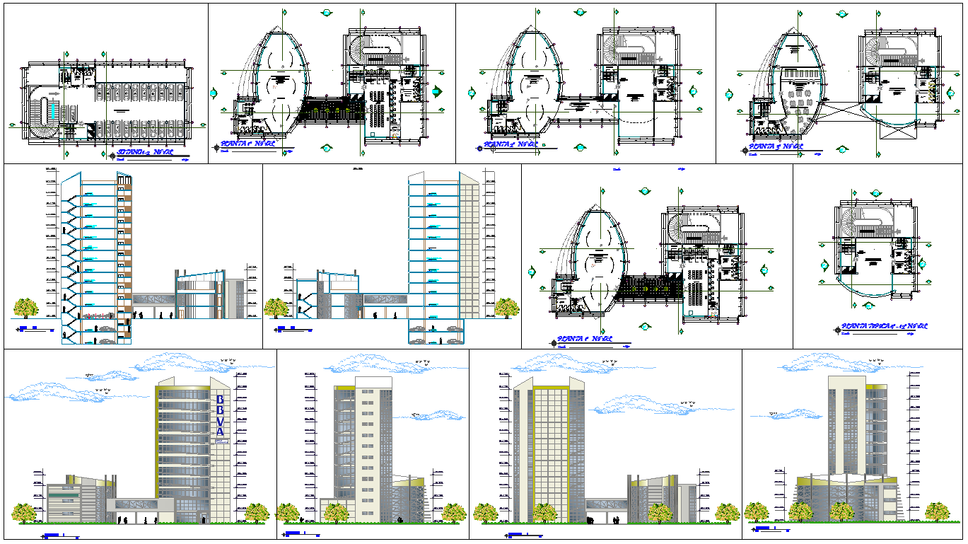 Modern commercial building architecture design in autocad dwg files. Include presentations plan, working plan, sections, elevations, constructions detail.