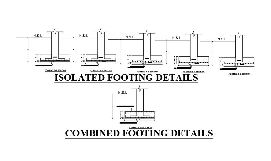 Isolated footing details are given in this AutoCAD 2D drawing. 5 isolated footings are provided with reinforcement details. And also, one combined footing details are provided. For more details download the AutoCAD drawing file from our cadbull website.