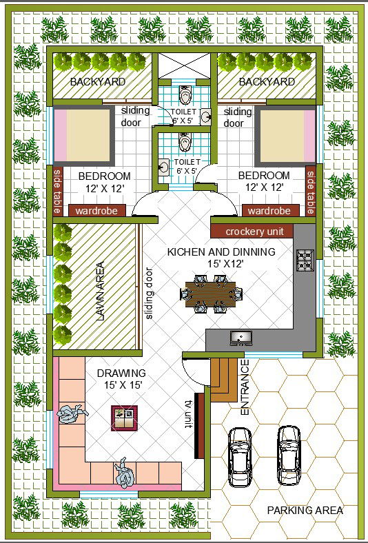 40' x 60' East facing house plan as per Vastu shastra. The total plot area is 2400 sqft. The total Buildup Area is 1500 Sqft. On this ground floor plan, a 2 master bedroom with an attached toilet, a kitchen, dining, a living room, a lawn area, backyard, and Car parking is available. for more details Download the free 2D cad drawing file.
