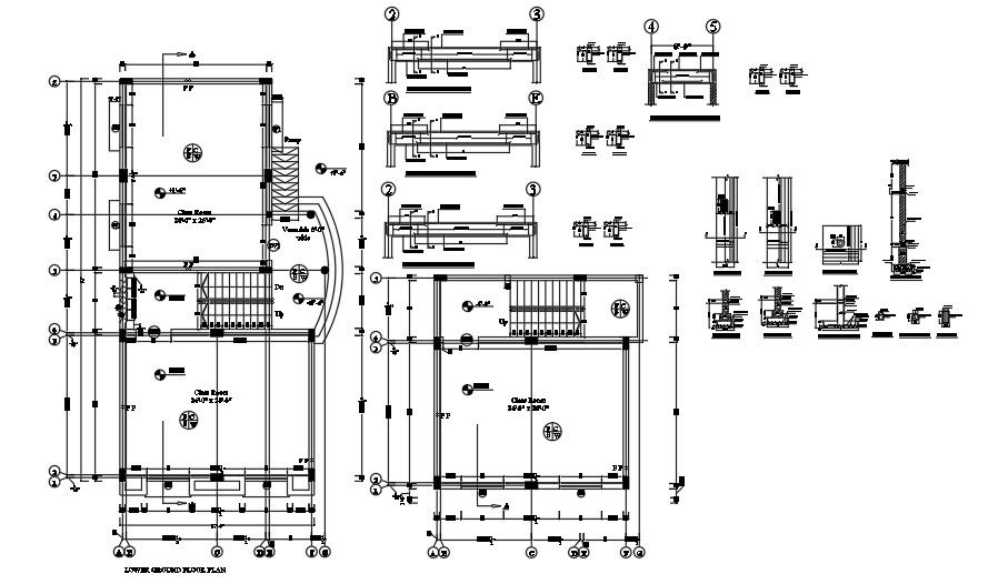 138’x105’ girls primary to middle school lower ground floor plan view is given. The lower ground floor column section is given with measurement details. Ramp, bathroom, verandah, and class rooms are available. For more details download the AutoCAD drawing file from our cadbull website.