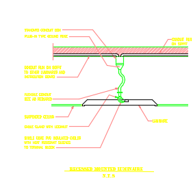 Recessed mounted luminaire construction detail drawing is given. Conduit run on soffit, standard conduit box, plug in type ceiling rose, suspended ceiling, cable gland with locknut, and single core PVC insulated cables are mentioned. For more details download the AutoCAD drawing file from our cadbull website.