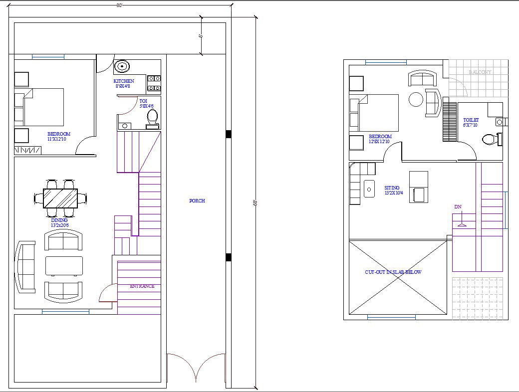 30' x 50' South Facing Ground Floor with First Floor House Plan with Furniture Details Cad File.
