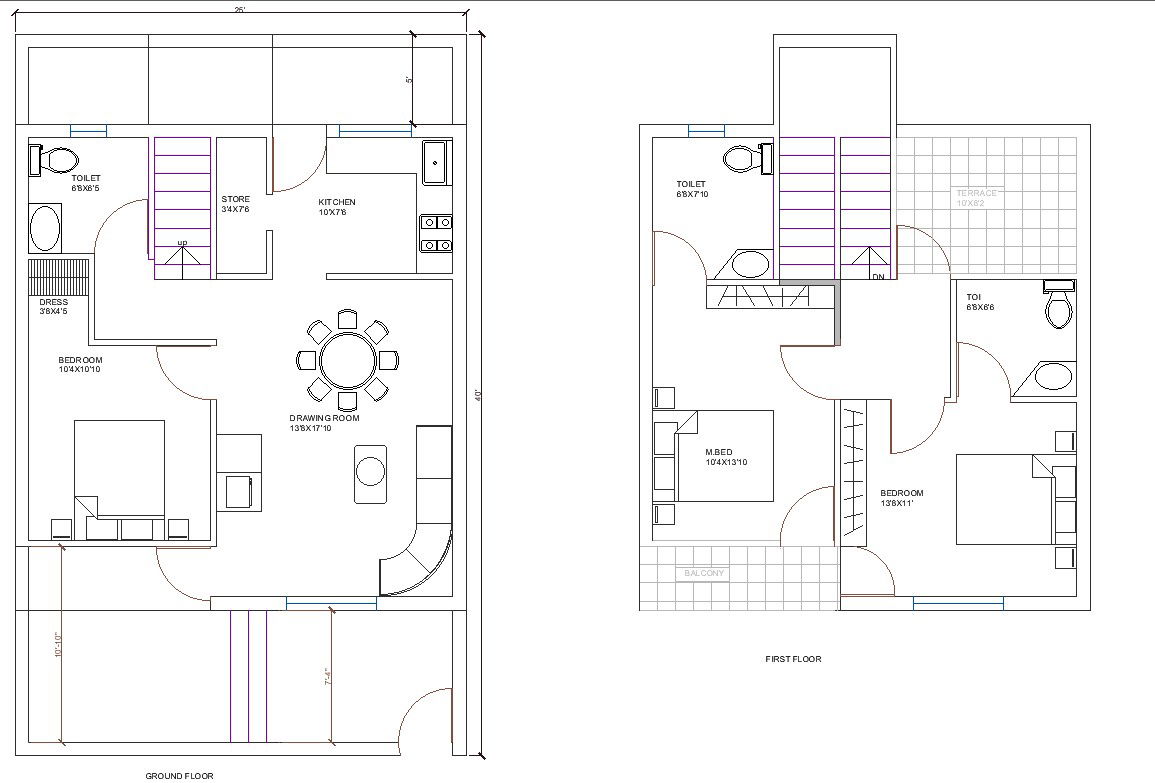 25' x 40' Ground Floor And First Floor Plan With Backyard Area Cad DWG File. This is a double-story residence with three bedrooms. The drawing and dining area combine with a big hall. This is followed by the kitchen and store behind. The kitchen opens up to the backyard behind. The guest room is on the ground floor while the master bedroom and child bedroom are on the first floor. The child's bedroom gets a balcony overlooking the main road. Here we find an interesting play of pyramidal form. The two-bedroom and the staircase bay and the balcony in front get a pyramidal roof at varying heights. The walls have a rough-textured finish. For more detail download this file.