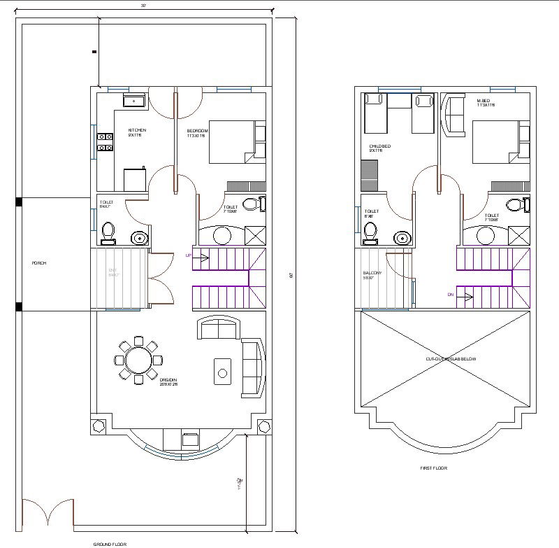 30' x 60' Ground Floor And First Floor Plan With Porch Area Architecture Cad DWG File.