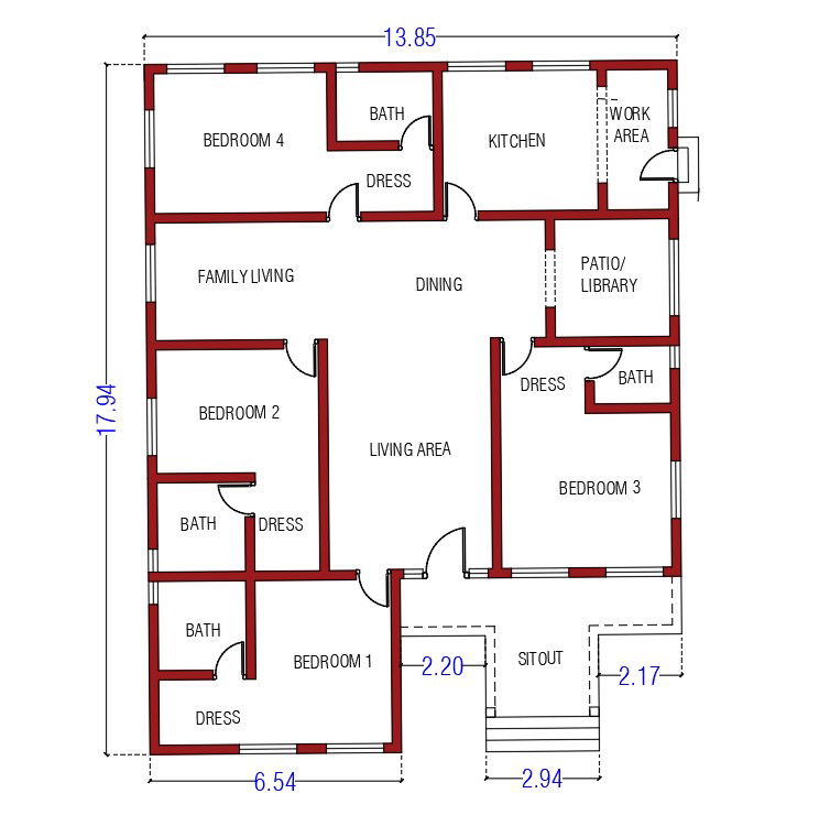 14x18m architecture 2D house plan CAD drawing is given in this file. This is a 4bhk house plan. Each bedroom is provided with attached toilet. The living room, kitchen, work area, library, dining area, sit out, family living room, master bedroom with the attached toilet and dressing area, two kid’s room with the attached toilet, and guest room with attached toilet & dressing areas are available. For more details download the CAD drawing file from our cadbull website.