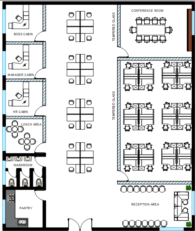 The architecture CAD drawing of the office building floor plan consists of an entrance, reception area conference room, accountant’s cabin, call officers, changing room, branch manager cabin, team leader, pantry, toilet and office boy table is also available in this CAD File. This office plan includes a conceptual floor plan built on a plot of size 50' x 60' This file includes DWG of the above-mentioned details. download AutoCAD house plan drawing DWG file. Visit CADBULL.COM Site.