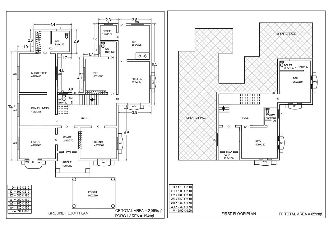15x18m architecture wonderful house plan CAD drawing is given in this file. The ground floor and first floor plans are given. On the ground floor, portico, sit out, foyer, dining area, living room, family room, kitchen, master bedroom with the attached toilet, kid’s room with attached toile, store room, and common bathrooms are available. On the first floor, the open terrace, bedroom with the attached toilet, hall, and balconies are available. For more details download the CAD drawing file from our cadbull website.