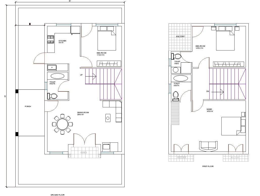 30' x 50' Double Storey Residence With Three Balcony Architecture cad File. This file contains double-storey residence with three bedrooms. The drawing and dining combine here to give us a big hall in front. The staircase drives the private areas from the social ones. Upstairs, the master bedroom gets two balconies overlooking the main road. The children's bedroom behind gets its own balcony. The front facade here is symmetrical about its entrance which is defined by the columns and the small pyramid. The overall form is that of a pyramid placed on a rectangular box. The corners are highlighted by the use of stone tiles. The doors and windows on the front facade are accentuated by the use of borders.