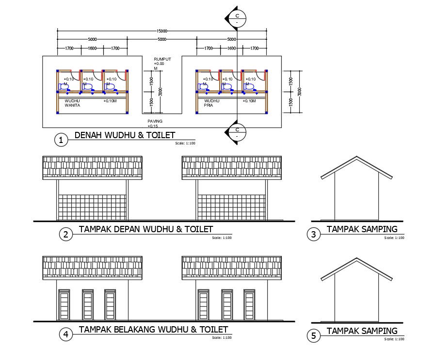 15000x3000mm public toilet plan is given in this CAD file. An elevation view of the bathroom is given. Totally three toilets are provided in each plan. The dimension of the each toilet is 1.7x1.5m. For more details download the CAD file from our cadbull website.