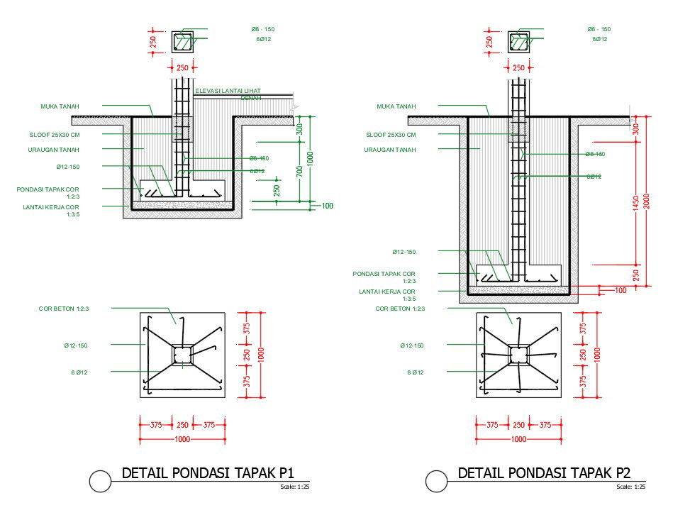 1000x1000mm foundation plan with section drawing is given in this CAD file. The dimension of the column cross section is 250x250mm. 12mm diameters of the rod are provided. 1:2:3 concrete is provided. For more details download the CAD file from our cadbull website.