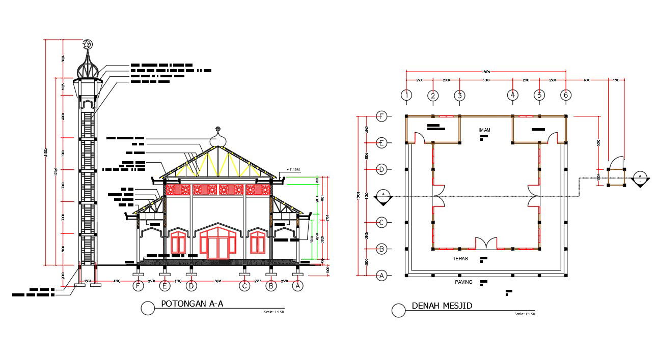 15x15m mesjid plan with section view drawing is given in this CAD file. The total area of the mosque is 225m2. The height of the mosque is 7751mm up to slab level. Pavements were done around the mosque building. A detail of the roof truss is provided. For more details download the CAD file from our cadbull website.