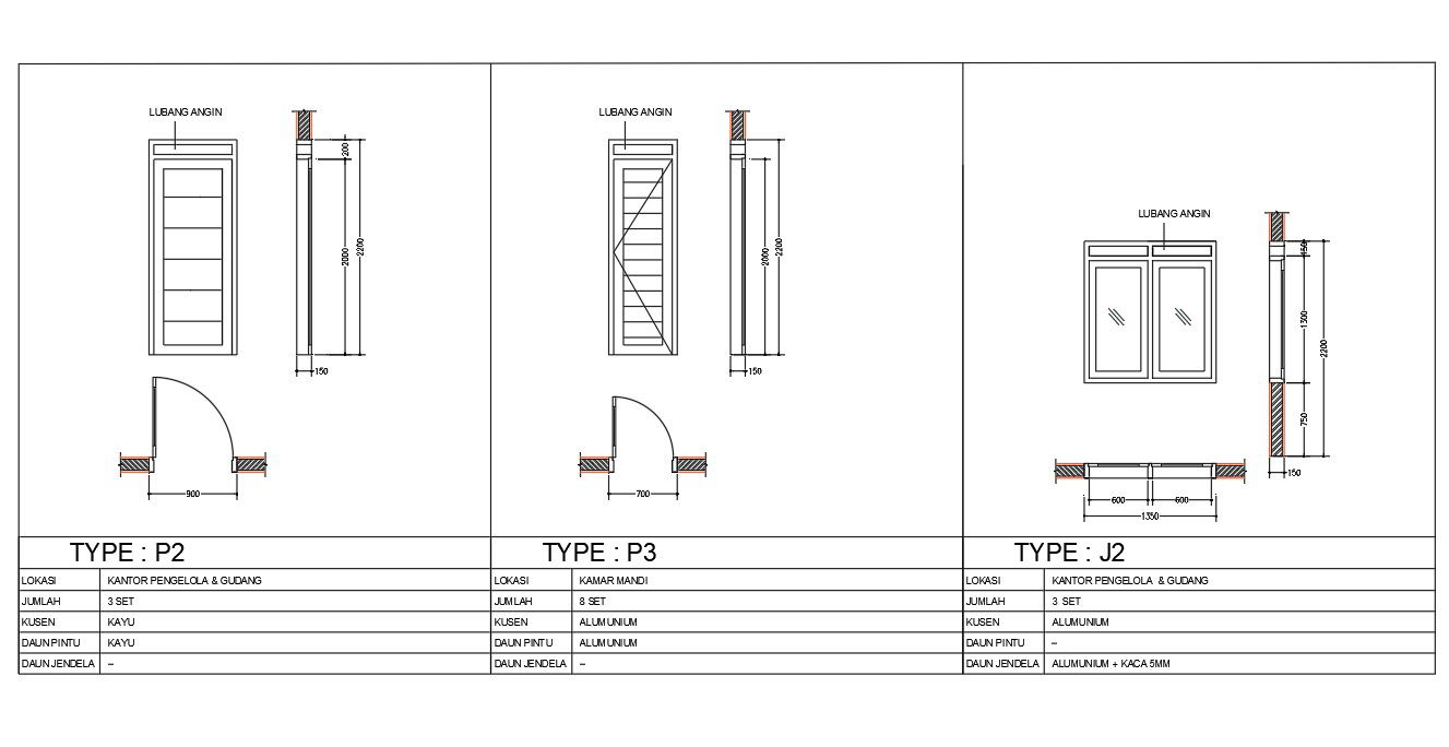 19x5m warehouse building door detail drawing is mentioned in this CAD model. One window plan, and two doors are given with measurements. The first door dimension is 900x2200mm. The second door plan is 700x2200mm. The dimension of the window is 1350x2200mm. For more details download the CAD file from our cadbull website.
