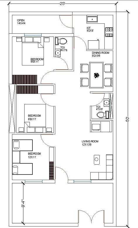 25' x 50' South Facing House Plan with Large Entrance Area DWG File