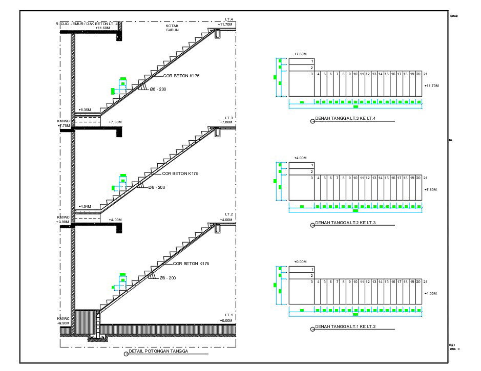 47x23m shopping building staircase section view is given in this file. A total height of the building is 11.7m. The staircase reinforcement is provided with dimensions. For more details download the CAD file from our cadbull website.