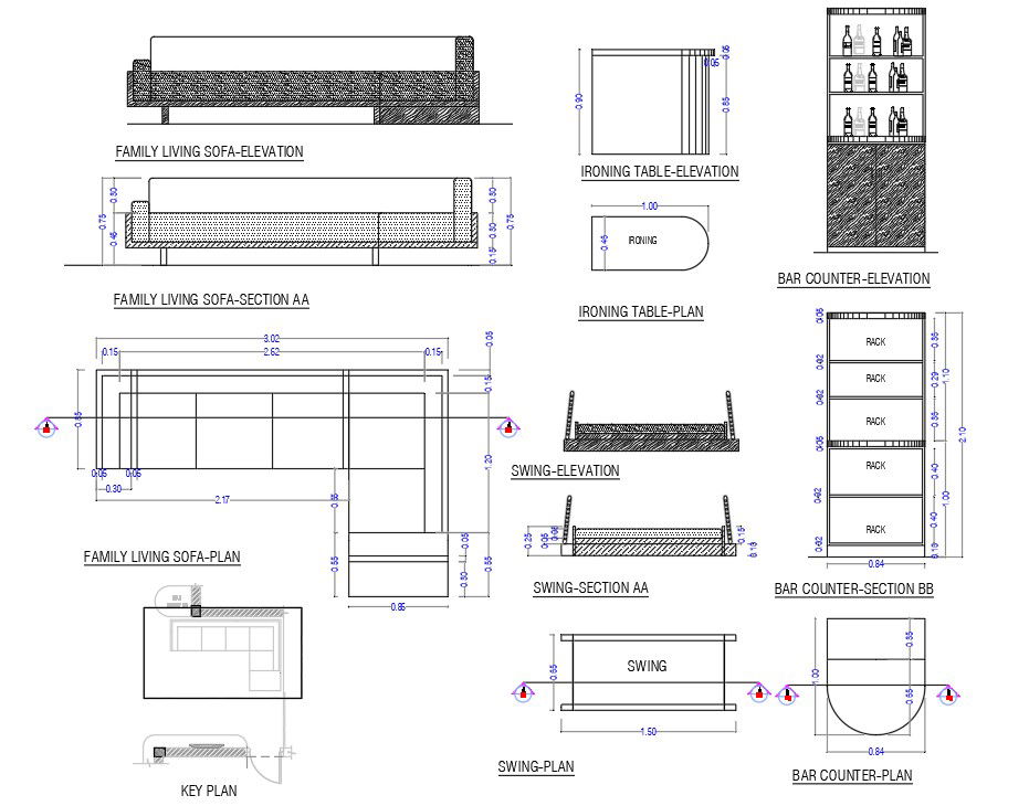 3x0.65m sofa plan, elevation, and section views are given in this model. This is provided for the family room. Ironing table plan, ironing table elevation, ironing table section, swing elevation, swing plan, bar counter plan, bar counter section, and bar counter section view is given. For more details, download the CAD drawing image and AutoCAD files from our website cadbull.