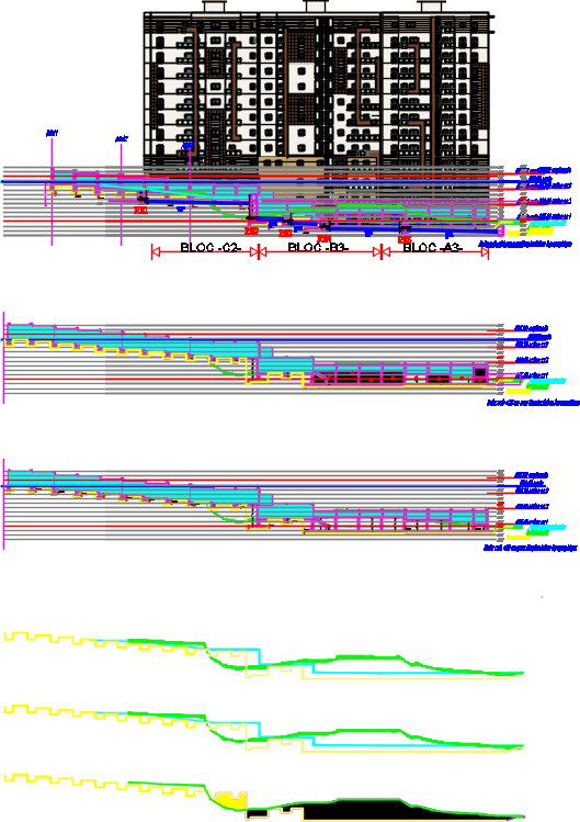 113x75m apartment building block1, block 2, and block 3 sanitary section view is given in this CAD model. On the front side section, the sanitary outlet lines are mentioned. This is multistory apartment building. For more detail download the AutoCAD drawing file from our cadbull website.
