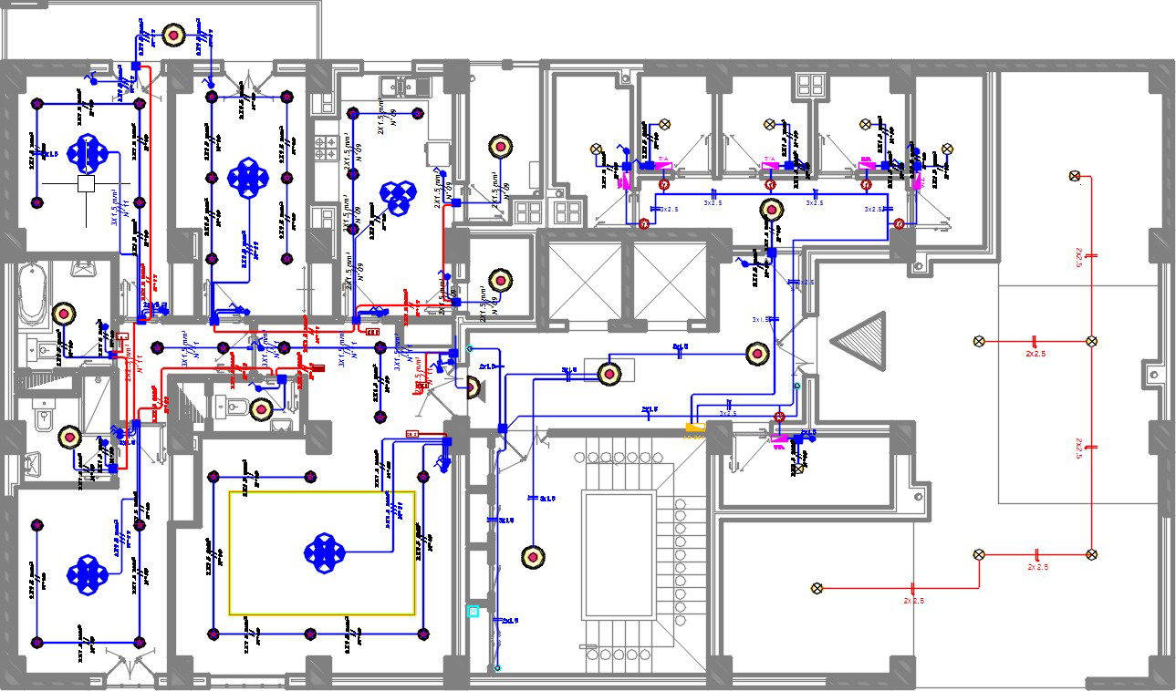 14x26m residential first floor house plan lighting drawing is given in this file. On each floor, two houses are available with 3bhk. On each house, the living room, kitchen, storage room, master bedroom with the attached toilet & dressing area, kid’s room with attached toilet, guest room, and balconies are available. The lift and staircase is provided middle of the two home. The area of the each room is given in the meter. For more detail download the AutoCAD drawing file from our cadbull website.
