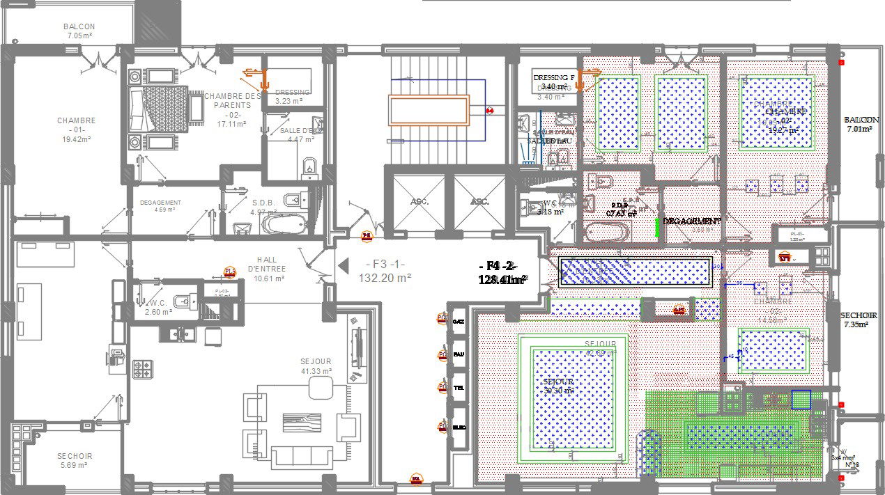 The furniture’s layout of the 14X26m house plan with 3bhk architecture drawing is given. On each floor, two houses are available with 3bhk. On each house, the living room, kitchen, storage room, master bedroom with the attached toilet & dressing area, kid’s room with attached toilet, guest room, and balconies are available. The lift and staircase is provided middle of the two home. The area of the each room is given in the meter. For more detail download the AutoCAD drawing file from our cadbull website.
