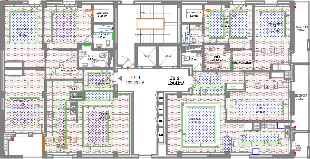 14X26m house plan sanitary CAD block location is given in this drawing. On each floor, two houses are available with 3bhk. On each house, the living room, kitchen, storage room, master bedroom with the attached toilet & dressing area, kid’s room with attached toilet, guest room, and balconies are available. The lift and staircase is provided middle of the two home. The area of the each room is given in the meter. For more detail download the AutoCAD drawing file from our cadbull website.