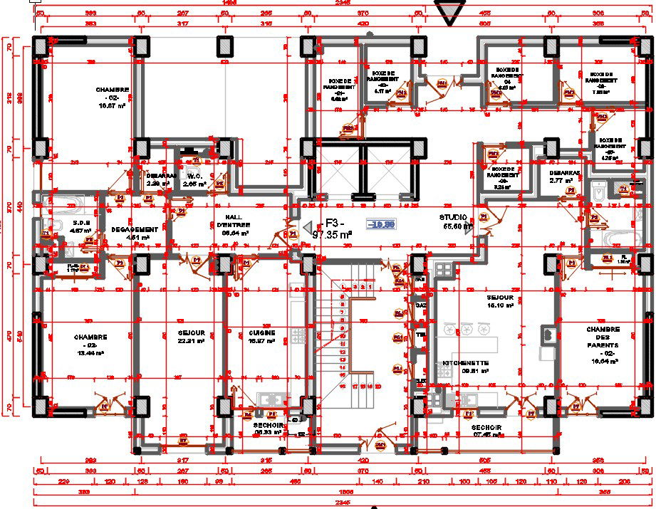 23x15m multistory apartment third floor house plan CAD drawing is given in this file. The lift is available on this plan. This apartment house plan given with the detailed view of the two house. On each floor two houses are available. This is a 3bhk house plan. On each house, the living room, dining area, kitchen, balcony, parent’s bedroom, kid’s room with the attached toilet, guest room, and common bathrooms are available. This plan is given for the block A1, A2, and A3. The dimension of the each room is given in the m2. The length and breadth of the houses plans are mentioned clearly in this drawing. For more details download the AutoCAD drawing file from our Cadbull website.