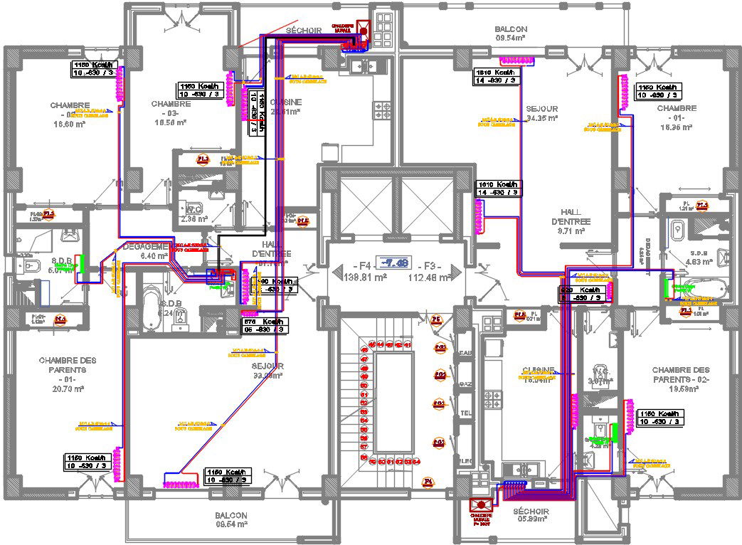 23x15m multistorey apartment 10th floor electrical dryer location drawing is given in this AutoCAD model. Two houses are available on this floor plan. Totally 4 bathrooms are provided. Each dryer electrical watt is 500w. On this plan, four dryers are provided for four bathrooms. For more details download the AutoCAD drawing file from our Cadbull website.