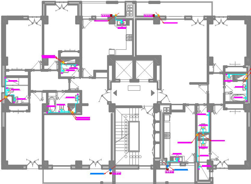 23x15m multistory apartment 9th floor house plan sanitary line CAD drawing