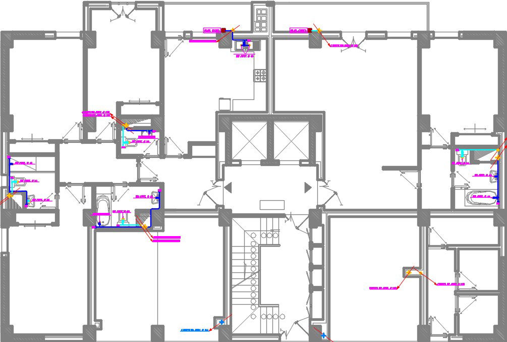 23x15m residential multistory apartment 10th floor pipe line layout CAD drawing