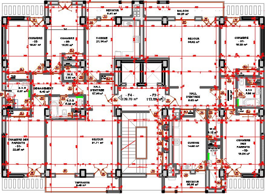 23x15m apartment 9th floor house plan CAD drawing is given in this file. On each house, the living room, dining area, kitchen, balcony, parent’s bedroom, kid’s room with the attached toilet, guest room, and common bathrooms are available. This plan is given for the block A1, A2, and A3. The dimension of the each room is given in the m2. On each floor two houses are available. This is a 3bhk house plan. The lift is available on this plan. This apartment house plan given with the detailed view of the two house. The dimension of the each room is given in the m2. The length and breadth of the houses plans are mentioned clearly in this drawing. For more details download the AutoCAD drawing file from our Cadbull website.