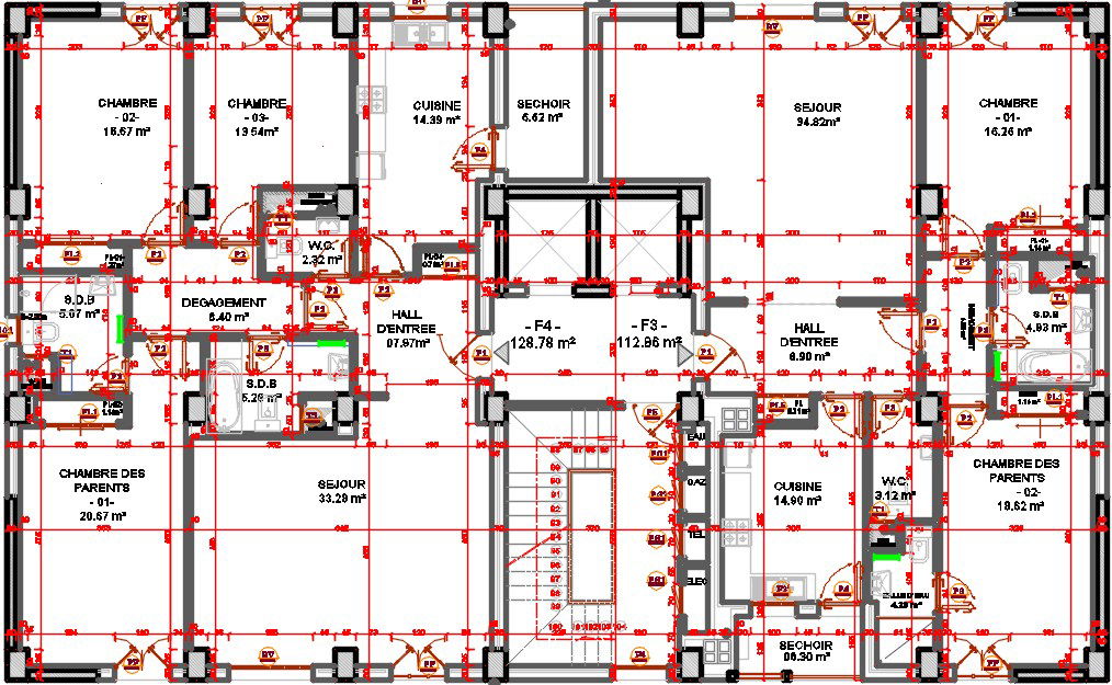 23x15m Block A2 apartment floor plan design is given in this 2D DWG drawing model. Detail plans of the two houses are given. On this floor, two houses are available. On the first house, the living room, balcony, master bedroom with attached toilet, kid’s room with attached toilet, guest room, kitchen, and common bathrooms are available. On the second house 2 bedrooms are available. The living room, balcony, master bedroom with attached toilet, kid’s room with attached toilet, kitchen, and common bathrooms are available. For more details download the AutoCAD drawing file from our Cadbull website.